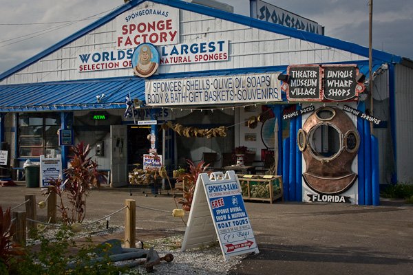 The shops along Dodecanese Avenue in the Sponge Dock District of Tarpon Springs are still thriving as both a historic and a current tourist destination. The street winds its way from the bayou towards the Tarpon Springs Aquarium at the far end. Along the way it passes the marina and Sponge Boats docked along the north side of the street and the Historic Sponge Exchange on the south. There are many restaurants serving traditional Greek cuisine and fresh seafood that dot the street as well as quaint boutiques that sell everything from real sponges to imported goods. The street is narrow and reminiscent of a seaside village in Greece, with delivery trucks parked in the right of way and locals that greet each other in Greek and stop to chat without regard to the traffic.
