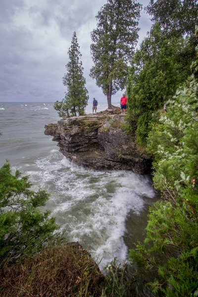 This is one of the more scenic places on the Door Peninsula of Lake Michigan. The coastline consists of cliffs, with the waves crashing into them, which has formed sea caves under the bluff line which rises 30 to 50 feet above the shoreline.. This is a must see place for photographers visiting Door County Wisconsin. When the wind is blowing across Lake Michigan from the east, the waves by crash into the shoreline and shoot streams of water high into the air. When the water is calm this is a favorite destination for kayaking. The park is located with the Whitefish Dunes State Park, with a trail running along the bluffs to the dunes.