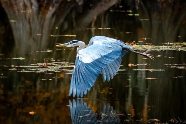 Great blue herons rarely venture far from bodies of water, but are occasionally seen flying over upland areas. They usually nest in trees or bushes near water’s edge, often on islands (which minimizes the potential for predation) or partially isolated spots.
