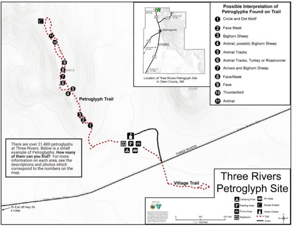 The site is located 17 miles north of Tularosa, NM, and 28 miles south of Carrizozo, NM on U.S. 54. Turn east from U.S. 54 at Three Rivers onto County Road B30 and travel five miles on paved road, following signs.