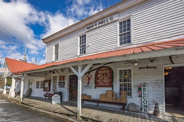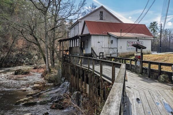 Nora Mill is a fully operational gristmill (one of the few that still grind corn) located on the banks of the Chattahoochee River outside of Helen, Georgia. Built in 1876, the mill is four stories tall, has 1,500 pound French Burr Mill Stones, a 100-foot wooden raceway and a water turbine rather than a water wheel.