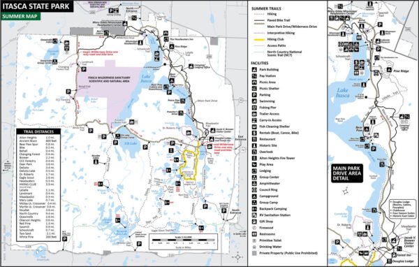 Itasca State Park was established by the Minnesota Legislature on April 20, 1891, making it the first of Minnesota’s state parks and second oldest in the United States, behind Niagara Falls State Park. Henry Schoolcraft determined Lake Itasca as the river’s source in 1832. It was named as a National Natural Landmark in 1965, and was added to the National Register of Historic Places in 1973. About 500,000 people visit Itasca State Park annually.