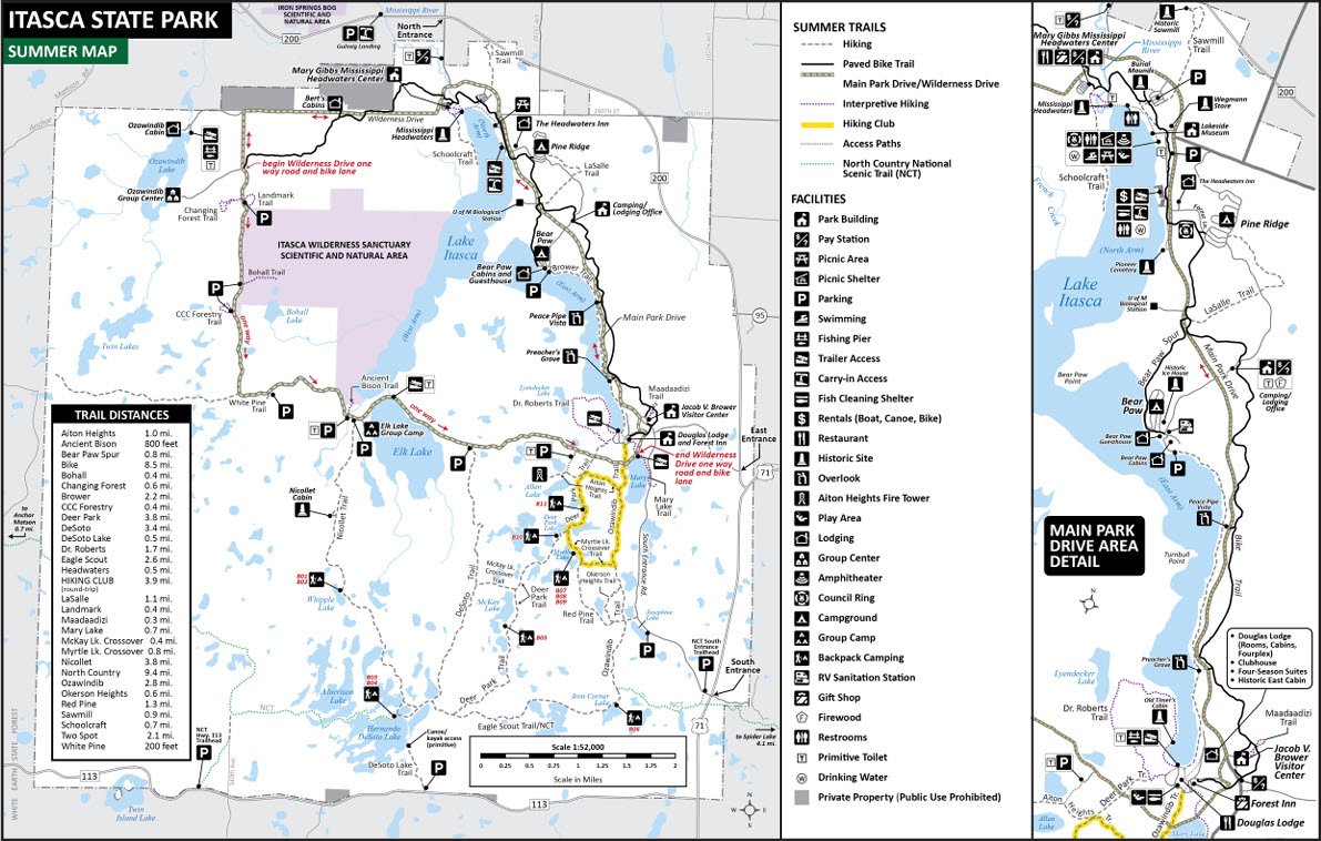 Itasca State Park was established by the Minnesota Legislature on April 20, 1891, making it the first of Minnesota’s state parks and second oldest in the United States, behind Niagara Falls State Park. Henry Schoolcraft determined Lake Itasca as the river’s source in 1832. It was named as a National Natural Landmark in 1965, and was added to the National Register of Historic Places in 1973. About 500,000 people visit Itasca State Park annually.