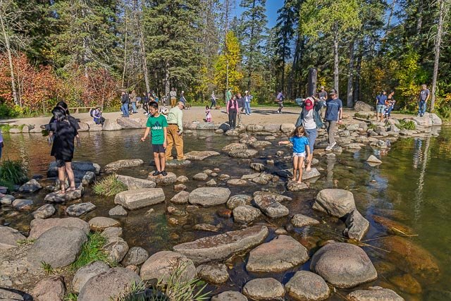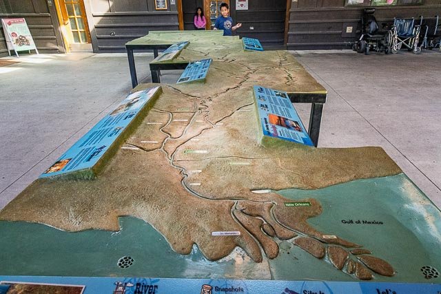 The headwaters of the Mississippi River are clearly defined by a 44 foot long outlet dam at the north end of Lake Itasca. This setup allows tourists to wade in shallow water or cross over it by way of the bridge constructed of logs.
