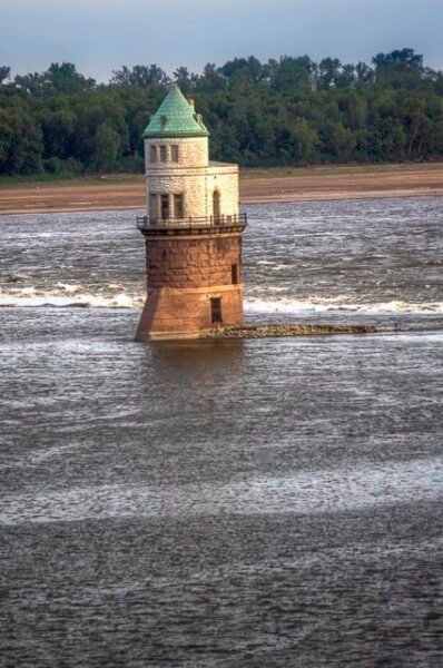 The bridge’s colorful name came from a 17-mile shoal, or series of rocky rapids, called the Chain of Rocks beginning just north of St. Louis. Multiple rock ledges just under the surface made this stretch of the Mississippi River extremely dangerous to navigate. In the 1960s, the Corps of Engineers built a low-water dam covering the Chain of Rocks. That’s why you can’t see them today. Back in 1929, at the time of the construction of the bridge, the Chain was a serious concern for boatmen.