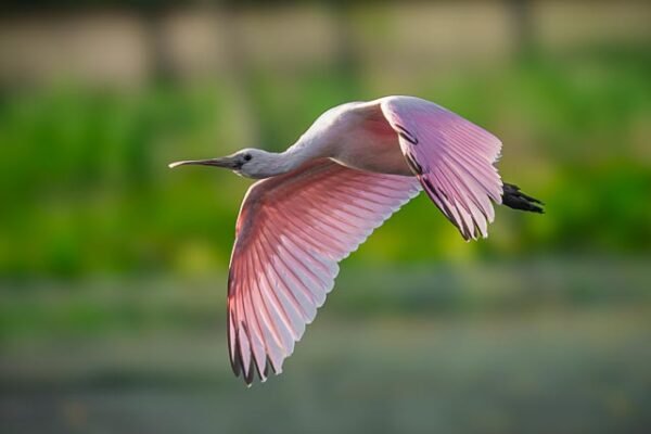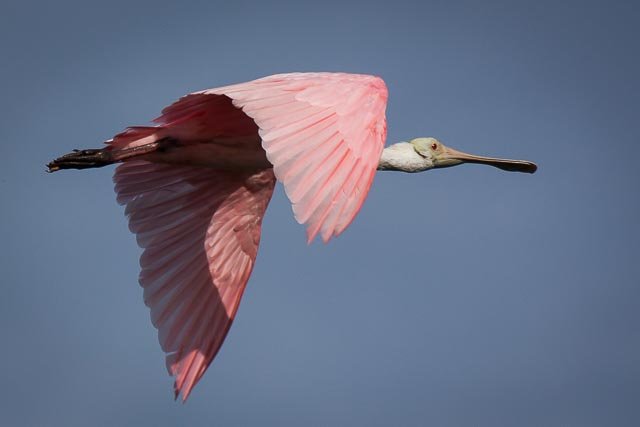 Like the American flamingo, their pink color is diet-derived, consisting of the carotenoid pigment canthaxanthin. Another carotenoid, astaxanthin, can also be found deposited in flight and body feathers. The colors can range from pale pink to bright magenta, depending on age, whether breeding or not, and location. Unlike herons, spoonbills fly with their necks outstretched. They alternate groups of stiff, shallow wingbeats with glides.