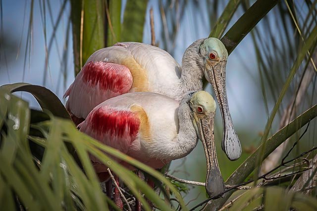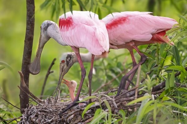 The roseate spoonbill nests in shrubs or trees, often mangroves, laying two to five eggs, which are whitish with brown markings. Immature birds have white, feathered heads, and the pink of the plumage is paler. The bill is yellowish or pinkish. Nestlings are sometimes killed by turkey vultures, bald eagles, raccoons and invasive fire ants.