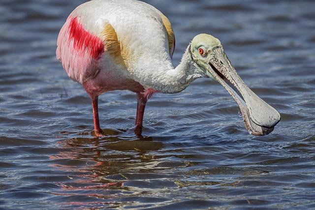 This species feeds in shallow fresh or coastal waters by swinging its bill from side to side as it steadily walks through the water, often in groups. Moreover, the spoon-shaped bill allows it to sift easily through mud.