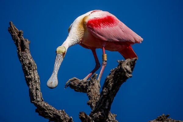 The bird feeds on crustaceans, bits of plant material, aquatic insects, mollusks, frogs, newts and very small fish (such as minnows) ignored by larger waders. Roseate spoonbills must compete for food with other freshwater birds, such as snowy egrets, great egrets, tricolored herons and American white pelicans. Roseate spoonbills are often trailed by egrets when foraging in a commensal “beater-follower” relationship, as the spoonbill’s disturbance of the sediment makes prey more available to the egret.