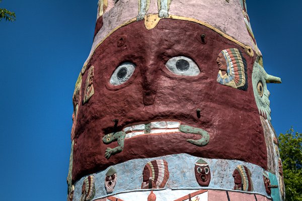 Ed Galloway built the totem pole over an 11 year period from 1937 to 1948, utilizing some 28 tons of cement, six tons of steel, and 100 tons of sand and rock. His tribute to the American Indian features 200 carved pictures, with four nine-foot Indians near the top each representing a different tribe.